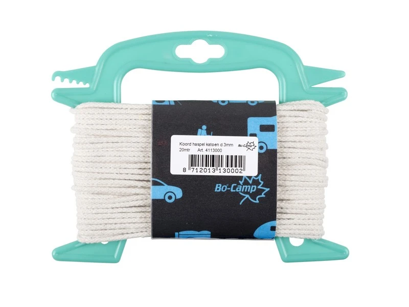 Scheerlijn van 20 meter op een haspel. Dit scheerlijnkoord is gemaakt van natuurlijk katoen. Voorkomt sporen en/of vlekken op de tent.
